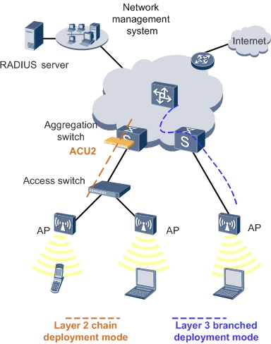 • The ACU2 provides access control capabilities on an enterprise wireless network. An aggregation switch with ACU2s provides both wireless and wired service capabilities, reducing space occupied and cables in equipment rooms and lowering network construction cost.