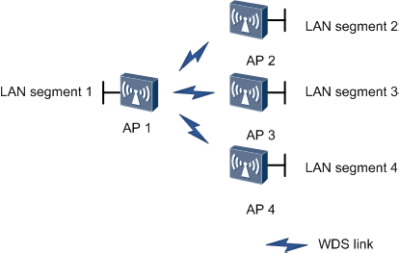 In this networking, the AP connects two or more independently wired or wireless LANs through wireless links to construct a network on which users can exchange data. In Wireless Distribution System (WDS) mode, the AP supports point-to-point (P2P) and point-to-multipoint (P2MP) networking modes. With 5 GHz and 2.4 GHz frequency bands, the AP can implement wireless bridging and access functions.