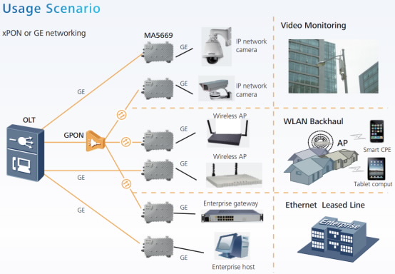 Блок MA5669 поддерживает функцию POE, поэтому его можно использовать в транспортной WLAN и системе видеонаблюдения. MA5669 подключается к терминалу оптических линий (OLT) через интерфейс GPON. В нисходящем направлении MA5669 с помощью кабеля 5-й категории подключается к AP или камере. Каскадное подключение кабелей питания POE обеспечивает высокую пропускную способность широкополосного доступа.