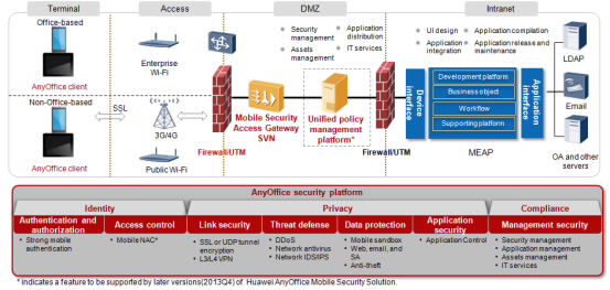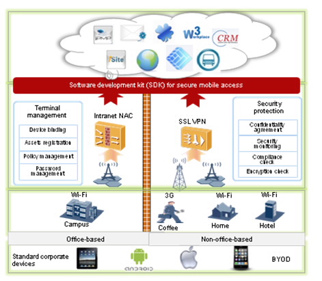 Компания Huawei предоставляет сбалансированное решение, ориентированное на устранение конфликта между потребностями сотрудников и соблюдением политики компании. Решение не только позволяет сотрудникам подключаться к внутренней сети своей компании в любое время, в любом месте и с любого устройства, но и обеспечивает надежную защиту безопасности. Huawei стремится обеспечить комплексное решение мобильной безопасности и гибкое внедрение приложений. Компания Huawei предлагает уникальное решение, в котором учтены высокие требования к безопасности мобильных устройств, сетевой передачи, приложений, конфиденциальной информации и к управлению безопасностью, а также обеспечивается баланс между высокой эффективностью и безопасностью мобильного офиса. В основе решения Huawei лежит простая платформа, поддерживающая миграцию всех приложений, с отличной расширяемостью и низкой стоимостью, которая позволит компаниям справиться со сложностями мобилизации.