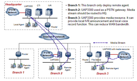 UAP3300 also supports distributed network. It can be deployed at remote branch as a PSTN gateway (like Branch 2 in the below picture). It also can be deployed at remote branch and provides local voice announcement and voice conference function (like branch 3 in the below picture). At this scenario, the communication between branch and HQ will be only signaling data, media stream communication will not occupy WAN bandwidth.