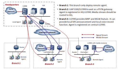 U2990 also can be deployed at branch site. The U2990 at branch site can be used as a local PSTN gateway or a local media resource server.