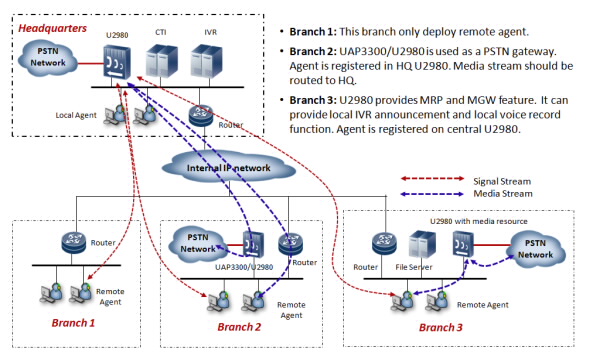 U2980 also can be deployed at branch site. The U2980 at branch site can be used as a local PSTN gateway or a local media resource server.