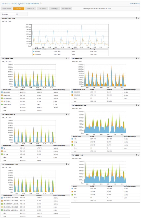 Overall network traffic analysis depends on high performance traffic analysis. Network administrators need only add a monitoring interface and configure the traffic sampling ratio before monitoring and analyzing interface traffic from multiple dimensions, including the following: