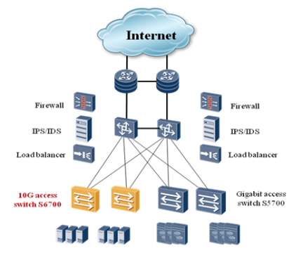As shown in the following figure, the S9300 Terabit routing switches function as core switches in a data center and use firewall and load balancer boards to ensure security and perform load balancing. The S6700s function as access switches and provide high-density 10GE ports to connect to 10G servers.