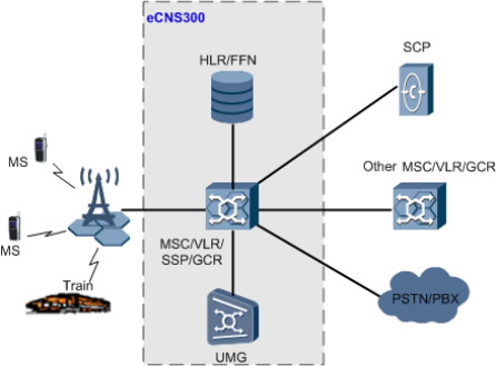 The eCNS300 solution customizes the HLR, MSC server, and MGW for GSM-R (railway—oriented communication) whose maximum number of subscribers is often smaller than 100 thousand. In this case, the HLR, MSC server, and MGW can be deployed together to meet requirements on the railway-oriented communication.