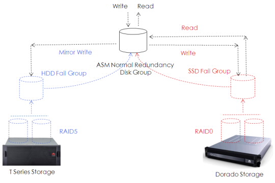 In Oracle 10 g R2 and above version, the combination of Oracle ASM function with Huawei T series arrays and Dorado solid state disk array can get high-reliability and high-performance. It makes SSD from Dorado and HDD from T series storage ASM a normal redundancy disk group, and choose Dorado as the main storage. Under normal workload, Oracle reads and writes on SSD and synchronizes the writing data automatically to HDD. Once the SSD fails, the business workload will switch to T series arrays automatically. This solution effectively guarantees the business continuity with reduced investment.