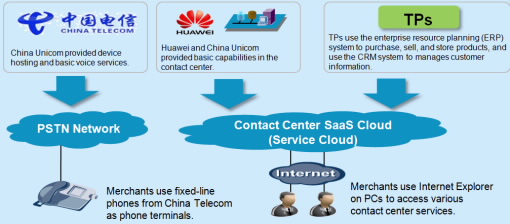 - Huawei Solution: Based on the eSpace contact center platform, the Huawei integrated solution neatly combines different series of products to provide various applications including cloud agent, cloud management, recording, QoS check/inspection, online attendant, online experts, and video services.