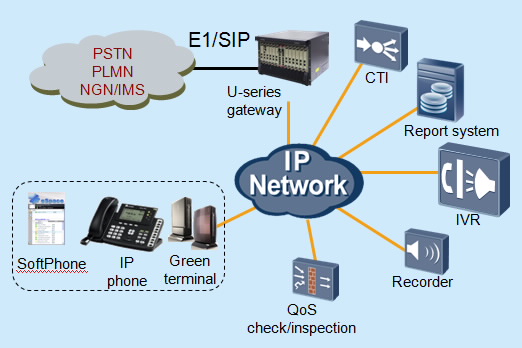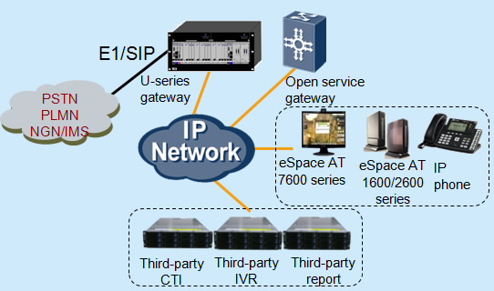 - Huawei Solution: Huawei U-series access gateways with open service gateways to connect to third-party CTI, IVR, and recording systems.